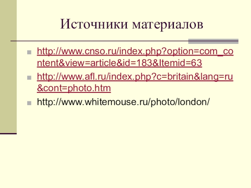 Источники материаловhttp://www.cnso.ru/index.php?option=com_content&view=article&id=183&Itemid=63http://www.afl.ru/index.php?c=britain&lang=ru&cont=photo.htmhttp://www.whitemouse.ru/photo/london/