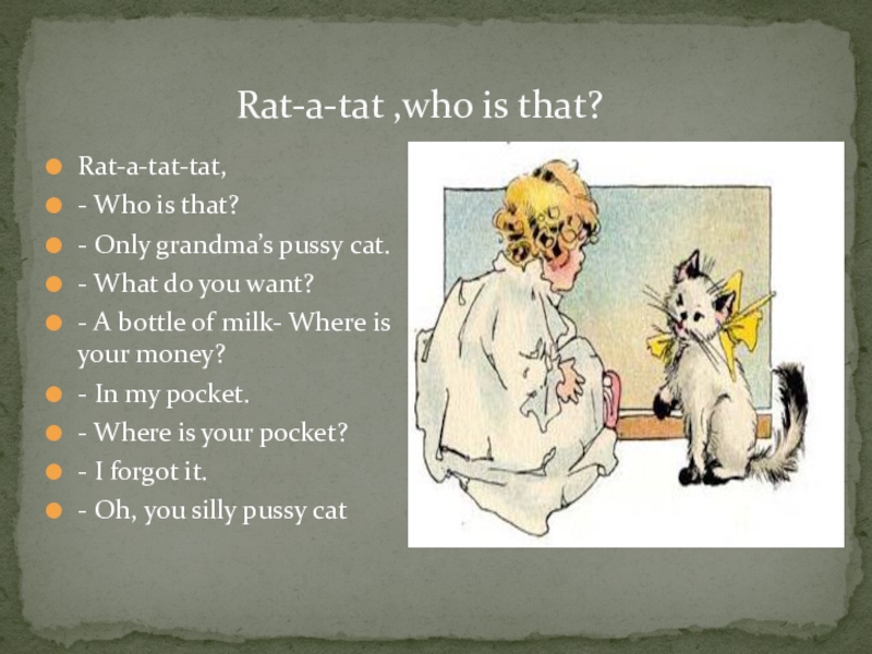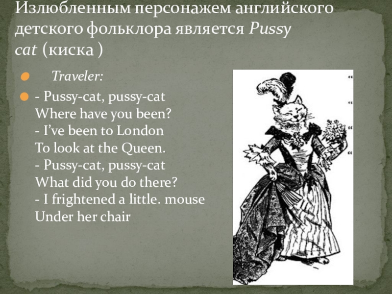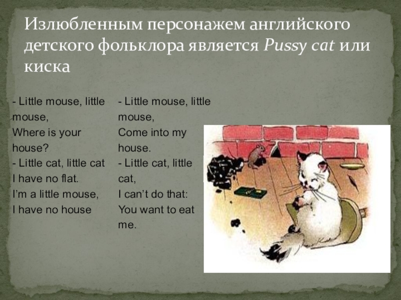 Излюбленным персонажем английского детского фольклора является Pussy cat (киска )