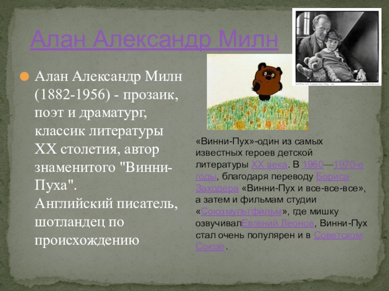 «Винни-Пух»-один из самых известных героев детской литературы XX века. В 1960—1970-е годы, благодаря переводу Бориса Заходера «Винни-Пух и все-все-все», а затем и фильмам студии «Союзмультфильм», где мишку озвучивалЕвгений Леонов, Винни-Пух стал очень популярен и в Советском Союзе.