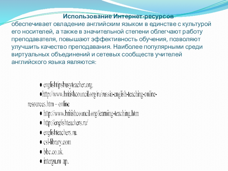 обеспечивает овладение английским языком в единстве с культурой его носителей, а также в значительной степени облегчают работу преподавателя, повышают эффективность обучения, позволяют улучшить качество преподавания. Наиболее популярными среди виртуальных объединений и сетевых сообществ учителей английского языка являются: