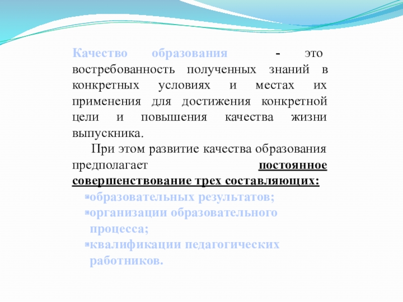 Слайд 3Качество образования - это востребованность полученных знаний в конкретных условиях и