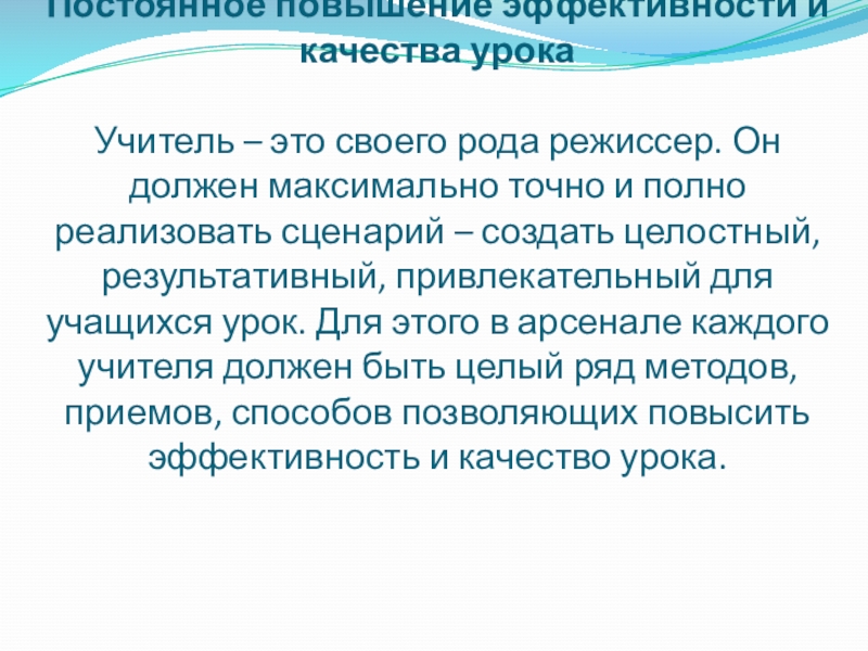 Он должен максимально точно и полно реализовать сценарий – создать целостный, результативный, привлекательный для учащихся урок. Для этого в арсенале каждого учителя должен быть целый ряд методов, приемов, способов позволяющих повысить эффективность и качество урока.