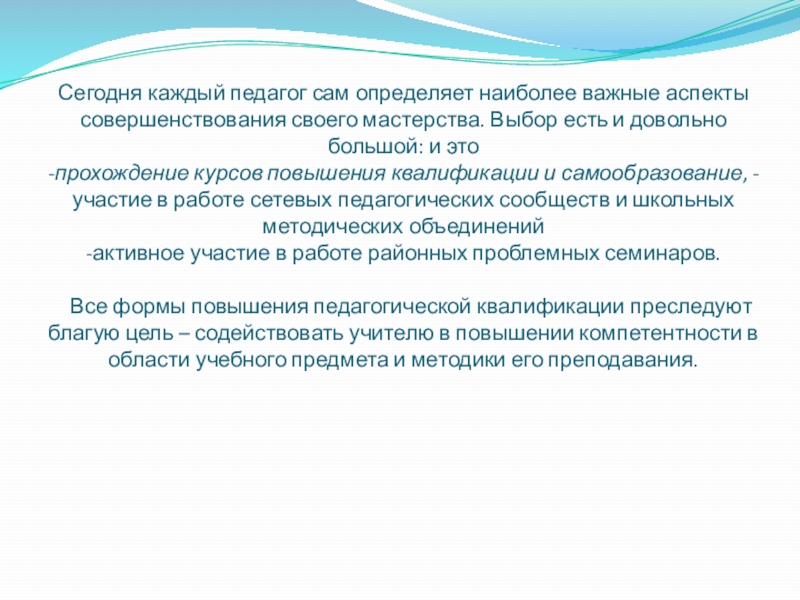 Слайд 16Сегодня каждый педагог сам определяет наиболее важные аспекты совершенствования своего мастерства.