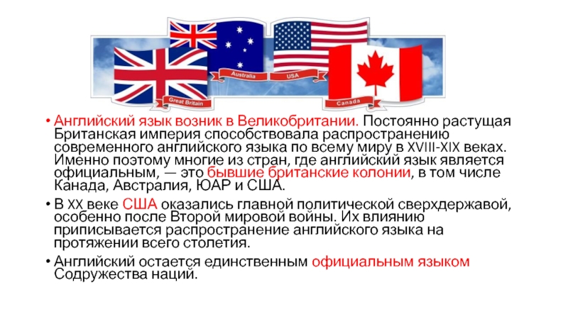 распространению современного английского языка по всему миру в XVIII-XIX веках. Именно поэтому многие из стран, где английский язык является официальным, — это бывшие британские колонии, в том числе Канада, Австралия, ЮАР и США.