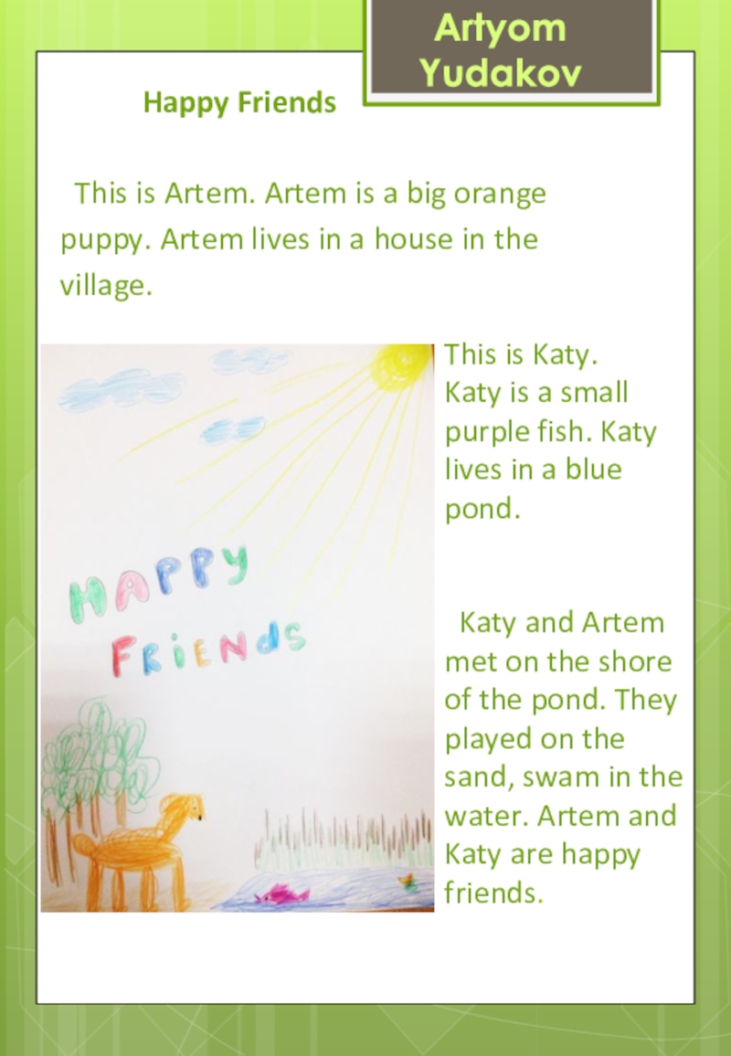 Katy and Artem met on the shore of the pond. They played on the sand, swam in the water. Artem and Katy are happy friends.