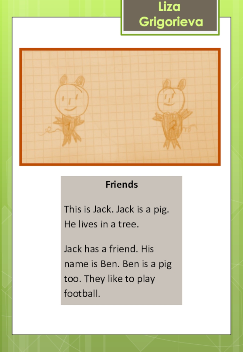 Liz met a cat, a cat’s dad, a pink pig, a pig’s mum.