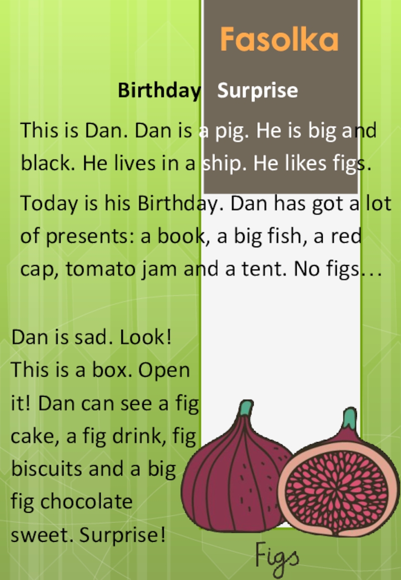 Dan is sad. Look! This is a box. Open it! Dan can see a fig cake, a fig drink, fig biscuits and a big fig chocolate sweet. Surprise!
