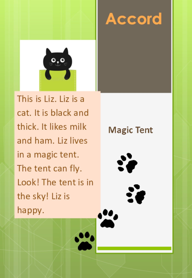Liz met a cat, a cat’s dad, a pink pig and a pig’s mum. They are eating, dancing and singing.