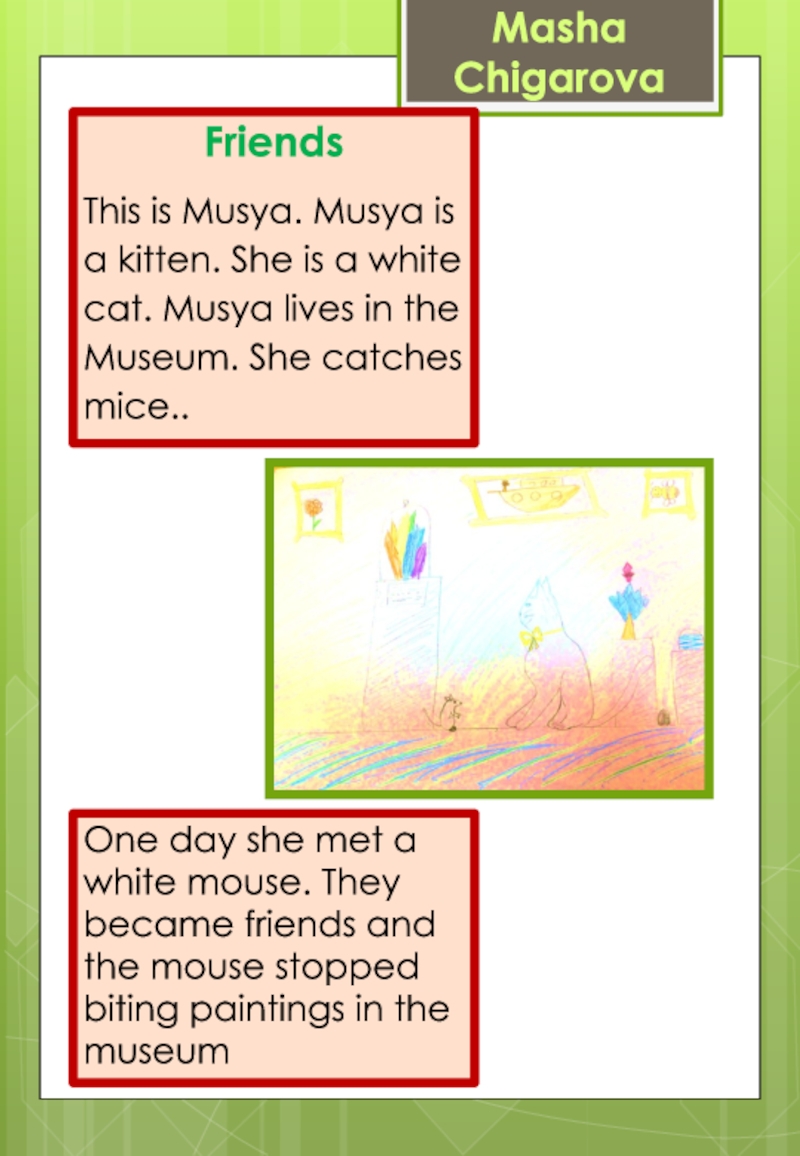 One day she met a white mouse. They became friends and the mouse stopped biting paintings in the museum
