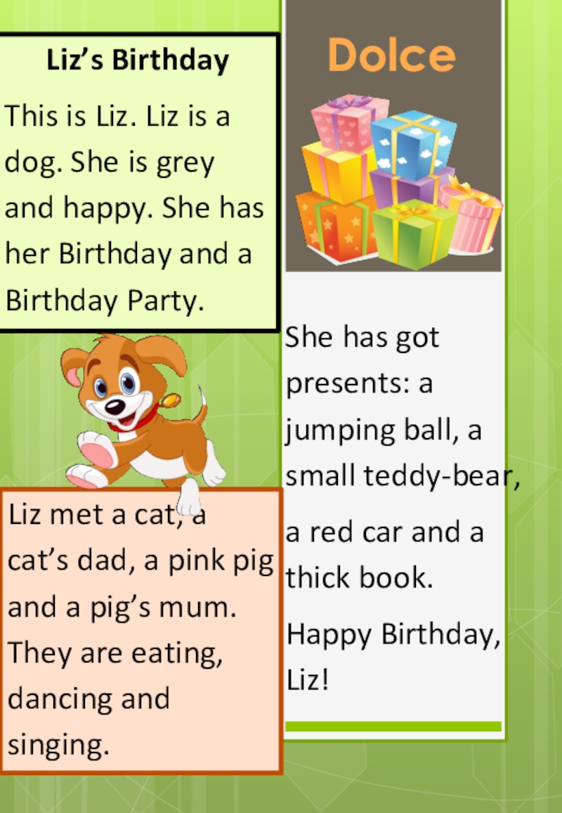 This is Liz. Liz is a dog. She is grey and happy. She has her Birthday and a Birthday party.
