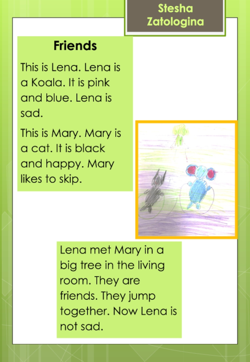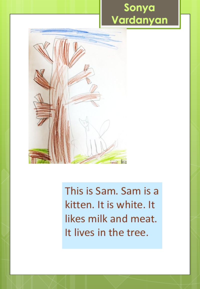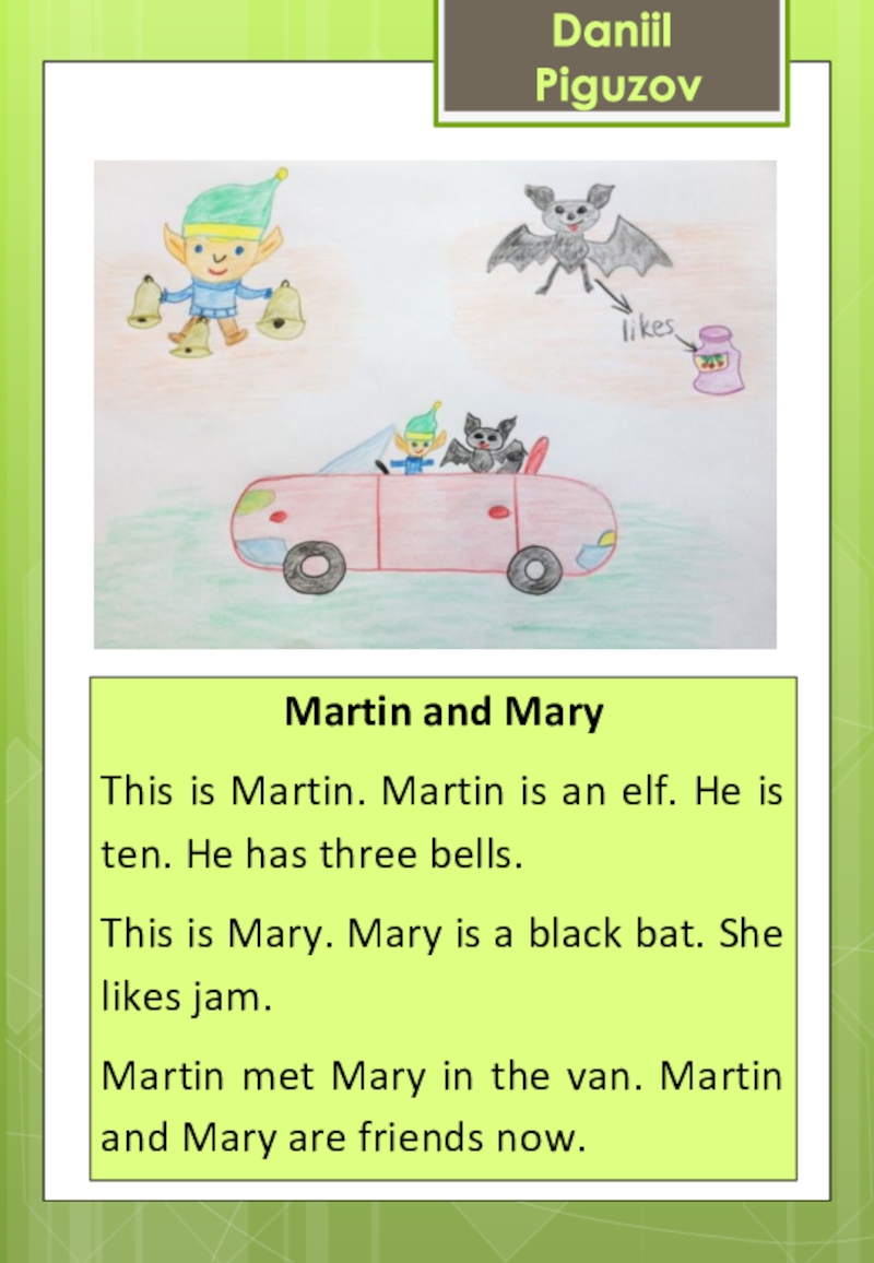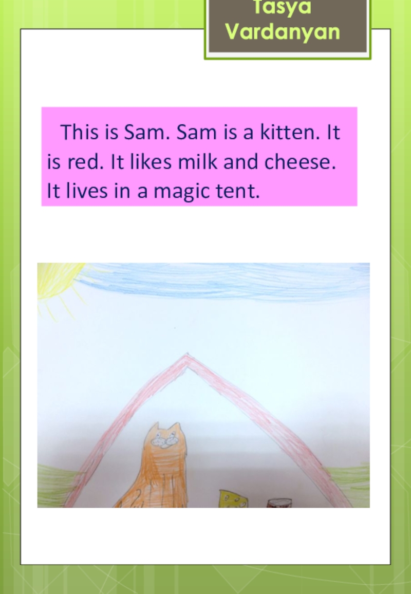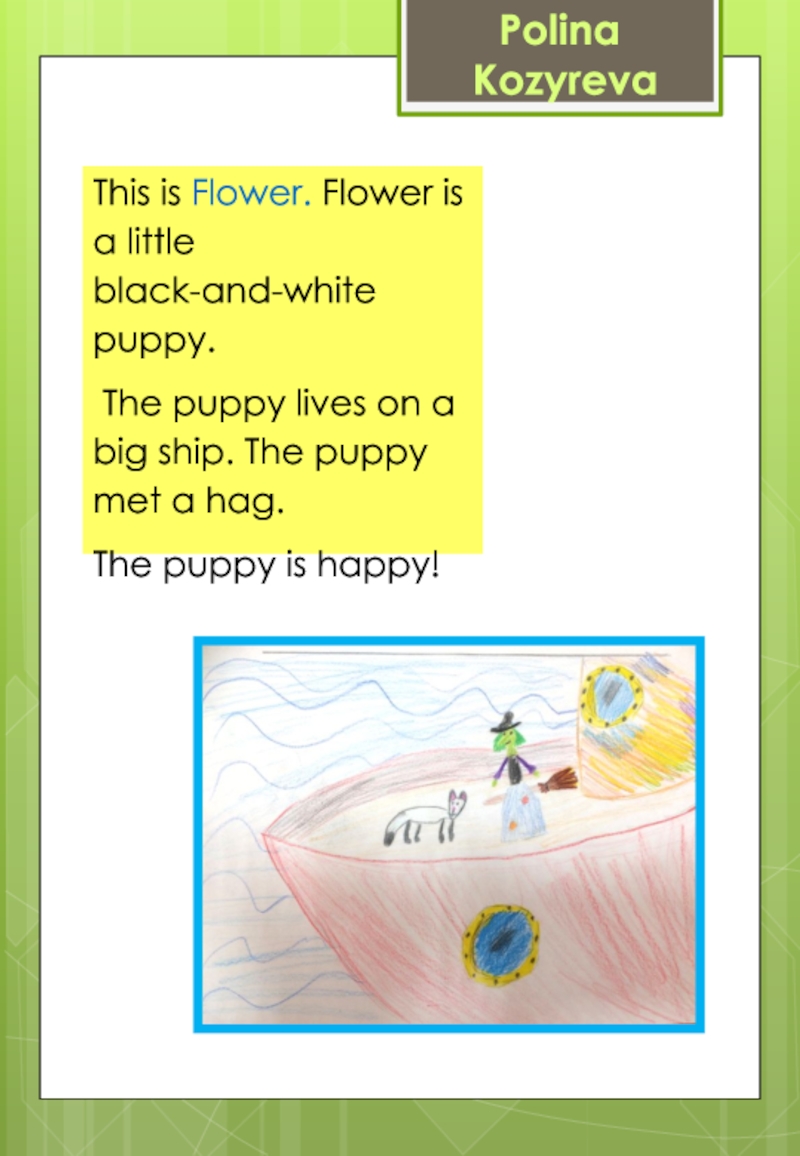 Kitty eats a very big cake. Dan dances. Fomka plays the piano. Lucy sings a happy song. Piggy ate (съел) ten cookies.