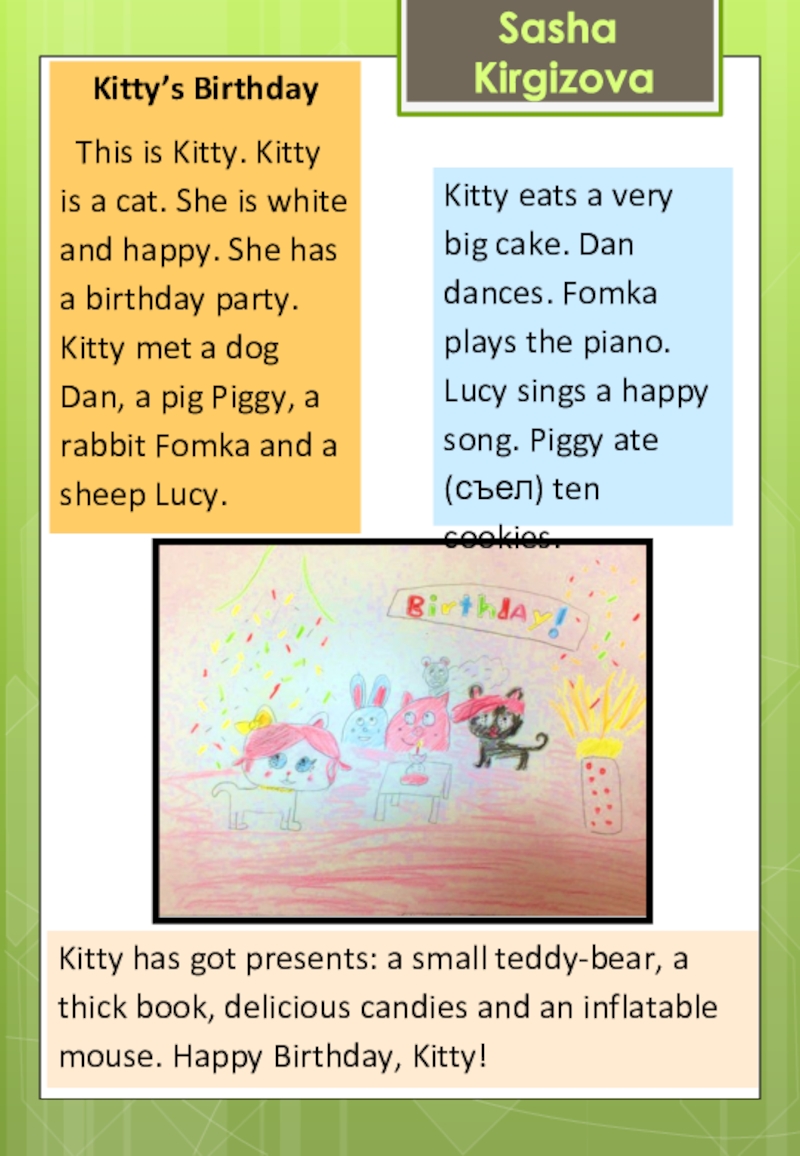 Kitty has got presents: a small teddy-bear, a thick book, delicious candies and an inflatable mouse. Happy Birthday, Kitty!