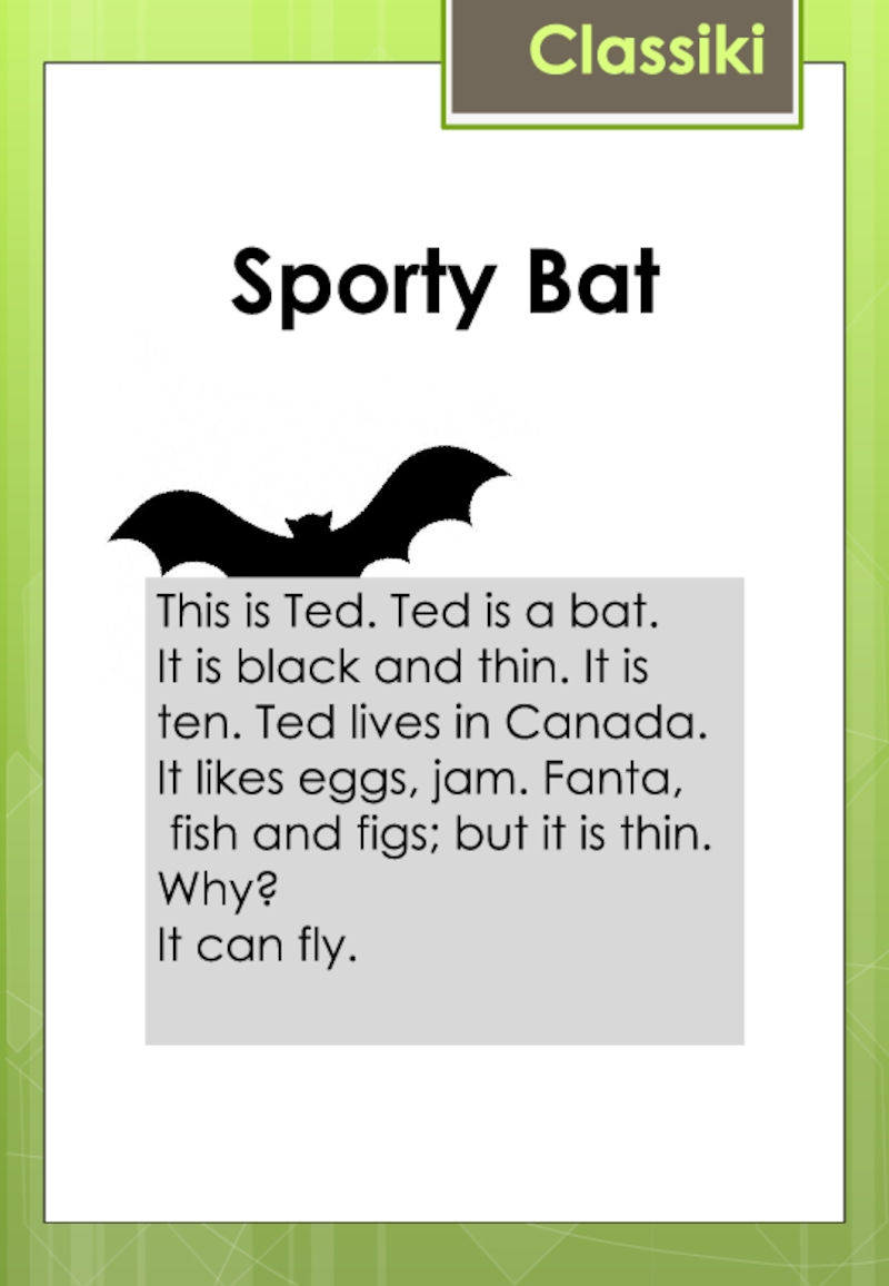 Jack sees the bee. It eats figs. Look! Raf is thick.