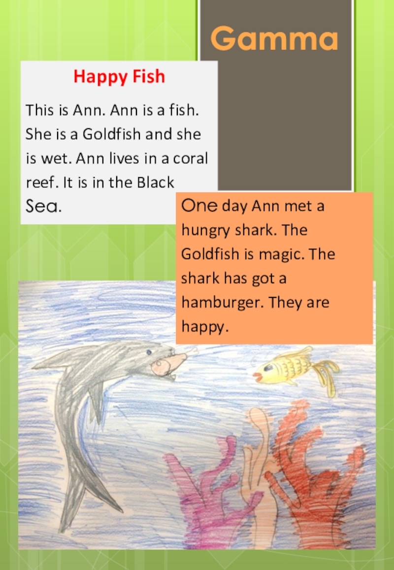 One day Ann met a hungry shark. The Goldfish is magic. The shark has got a hamburger. They are happy.