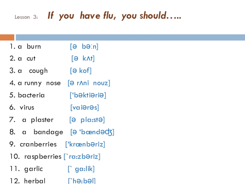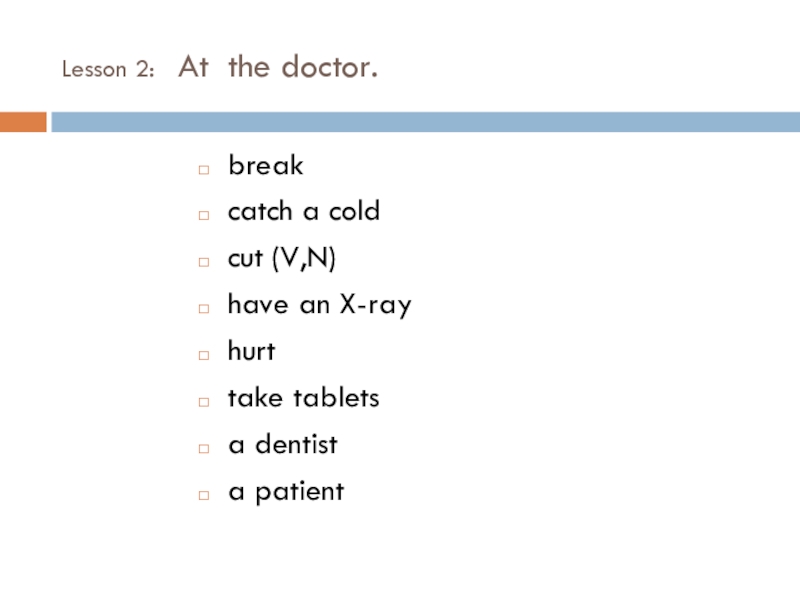 Lesson 2:  At the doctor.breakcatch a coldcut (V,N)have an X-rayhurttake tabletsa dentista patient