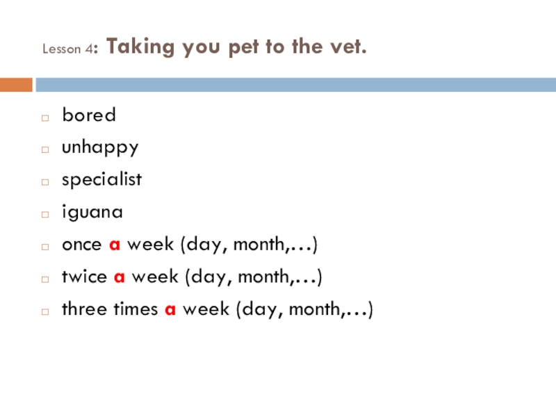 Lesson 4: Taking you pet to the vet.boredunhappyspecialistiguanaonce a week (day, month,…)twice a week (day, month,…)three times