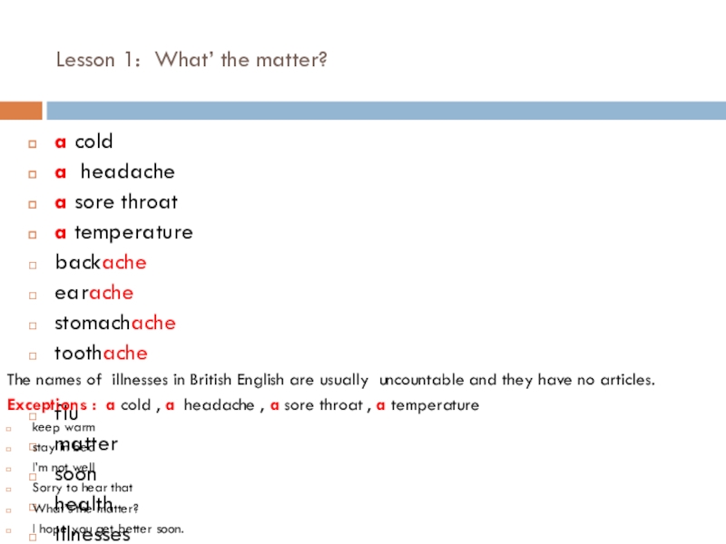 Lesson 1: What’ the matter?a colda headachea sore throata temperaturebackacheearachestomachachetoothacheflumattersoonhealthIllnessespoor The names of illnesses in British English are usually uncountable and they have no articles.Exceptions : a cold , a headache , a sore throat ,