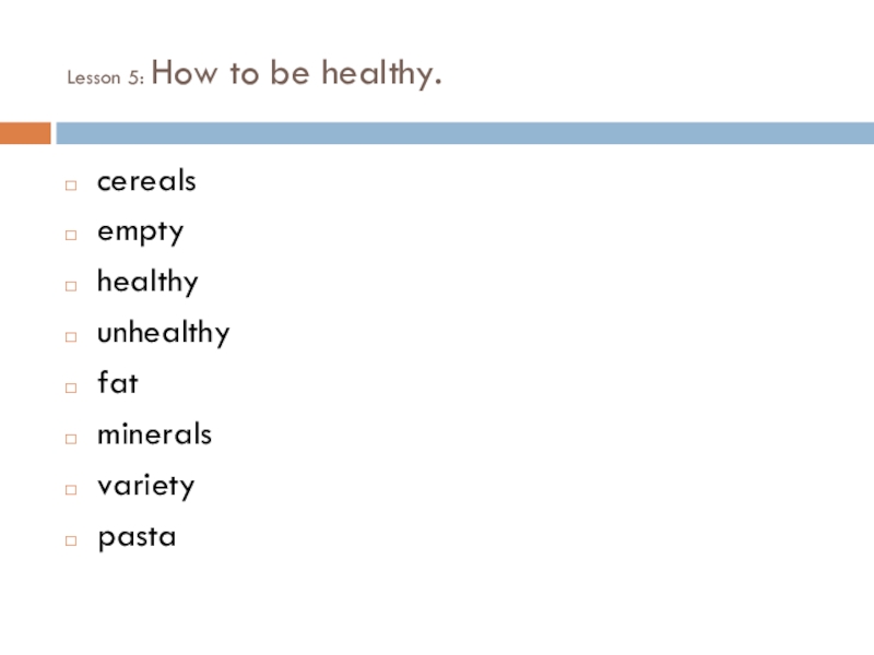Lesson 5: How to be healthy.cerealsemptyhealthyunhealthyfatminerals varietypasta
