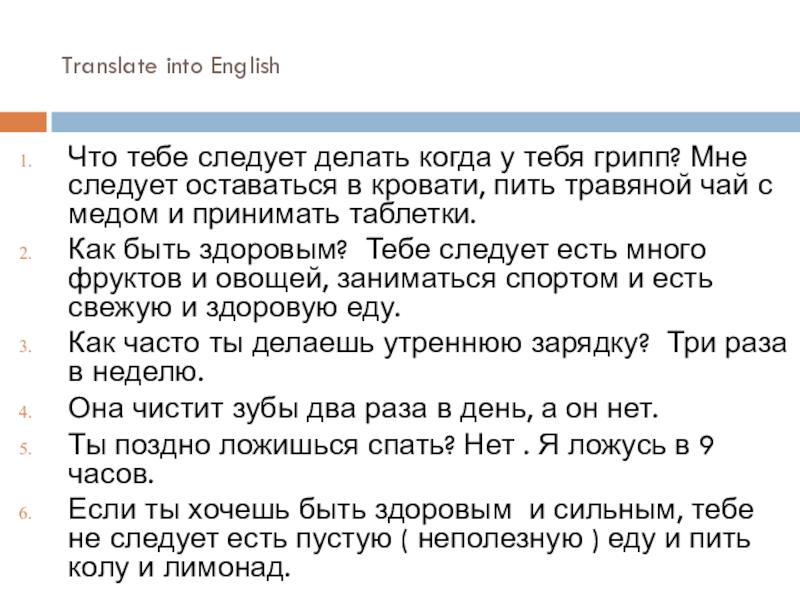 Translate into EnglishЧто тебе следует делать когда у тебя грипп? Мне следует оставаться в кровати, пить травяной