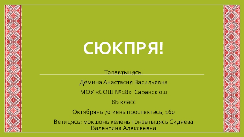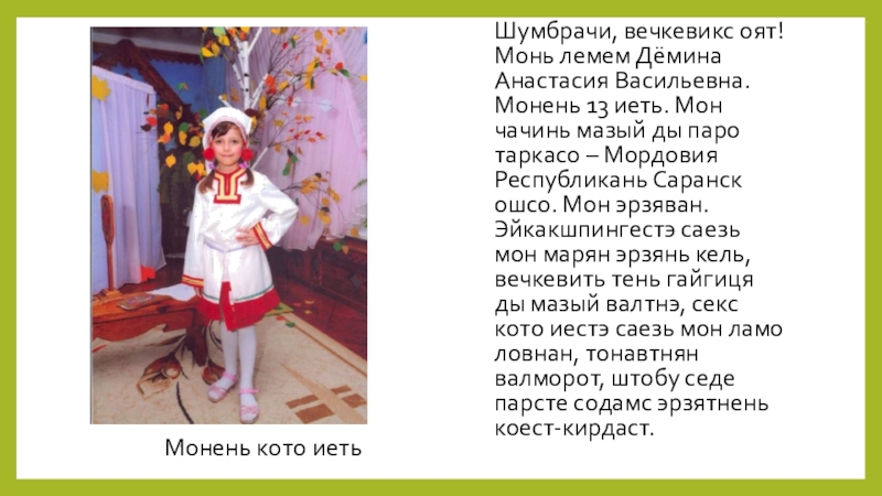 Шумбрачи, вечкевикс оят! Монь лемем Дёмина Анастасия Васильевна. Монень