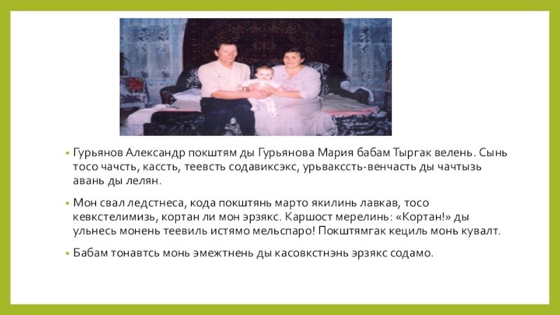Слайд 13Гурьянов Александр покштям ды Гурьянова Мария бабам Тыргак велень. Сынь тосо