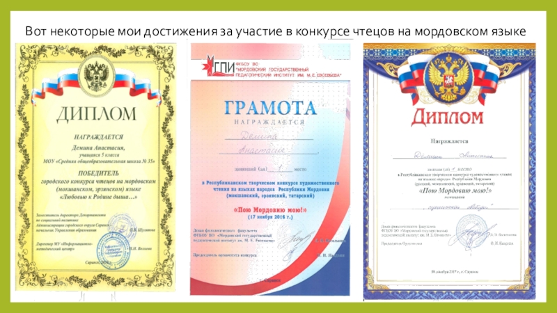 Слайд 8Вот некоторые мои достижения за участие в конкурсе чтецов на мордовском