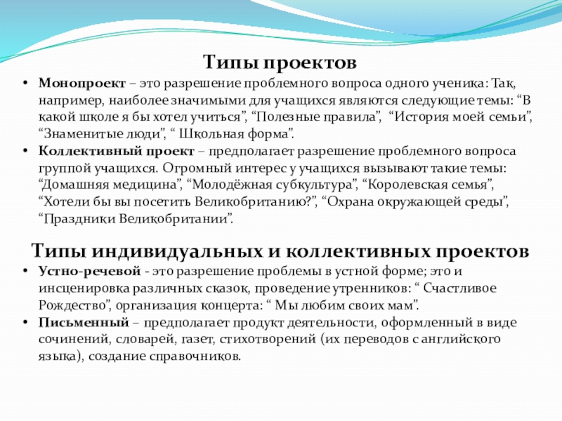 Коллективный проект – предполагает разрешение проблемного вопроса группой учащихся. Огромный интерес у учащихся вызывают такие темы: “Домашняя медицина”, “Молодёжная субкультура”, “Королевская семья”, “Хотели бы вы посетить Великобританию?”, “Охрана окружающей среды”, “Праздники Великобритании”.