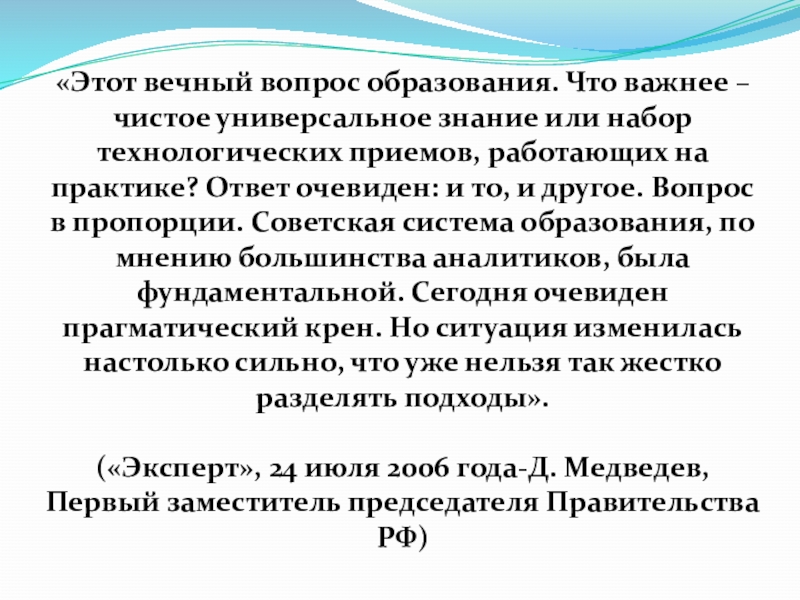 Слайд 2«Этот вечный вопрос образования. Что важнее – чистое универсальное знание или