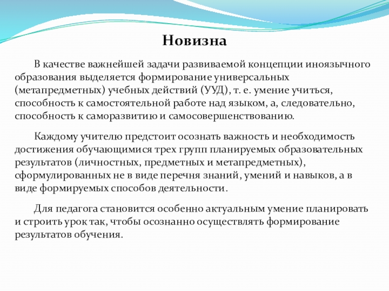 (метапредметных) учебных действий (УУД), т. е. умение учиться, способность к самостоятельной работе над языком, а, следовательно, способность к саморазвитию и самосовершенствованию.