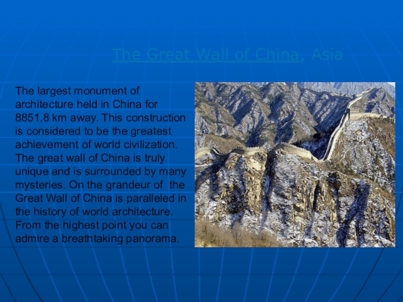 The largest monument of architecture held in China for 8851,8 km away. This construction is considered to be the greatest achievement of world civilization. The great wall of China is truly unique and is surrounded by many mysteries. On the grandeur of the Great Wall of China is paralleled in the history of world architecture. From the highest point you can admire a breathtaking panorama.