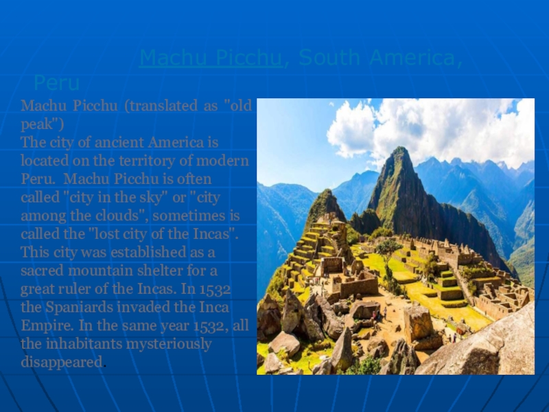 The city of ancient America is located on the territory of modern Peru. Machu Picchu is often called "city in the sky" or "city among the clouds", sometimes is called the "lost city of the Incas". This city was established as a sacred mountain shelter for a great ruler of the Incas. In 1532 the Spaniards invaded the Inca Empire. In the same year 1532, all the inhabitants mysteriously disappeared.