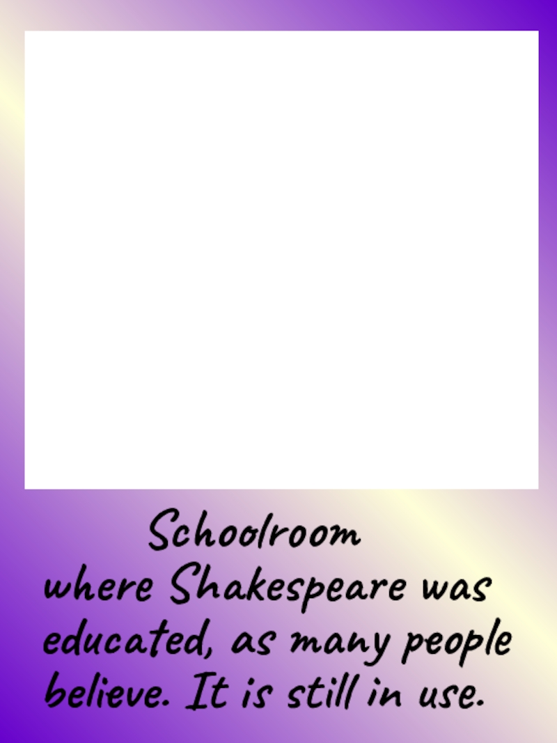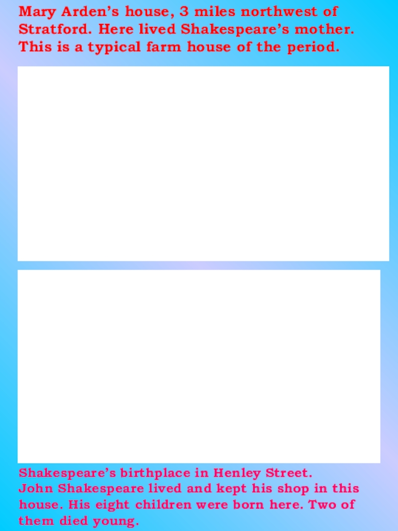 Shakespeare’s birthplace in Henley Street. John Shakespeare lived and kept his shop in this house. His eight children were born here. Two of them died young.