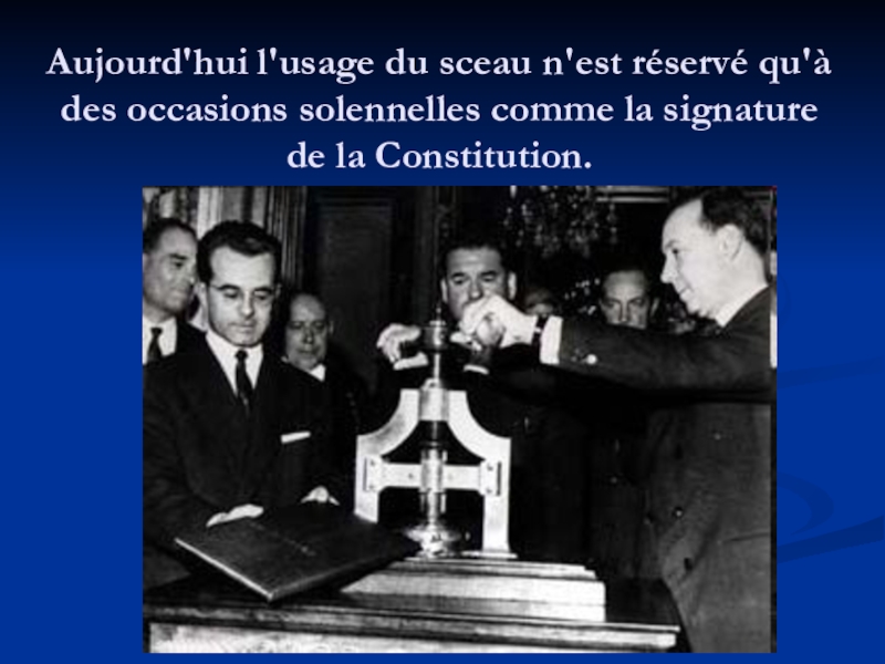 Слайд 9Aujourd'hui l'usage du sceau n'est réservé qu'à des occasions solennelles comme