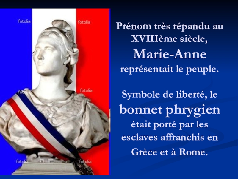 Слайд 14Prénom très répandu au XVIIIème siècle, Marie-Anne représentait le peuple. Symbole