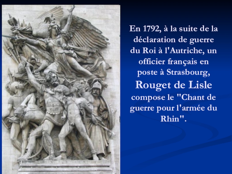 En 1792, à la suite de la déclaration de guerre du Roi à l'Autriche, un officier français en poste à Strasbourg, Rouget de Lisle compose le "Chant de guerre pour l'armée du Rhin".