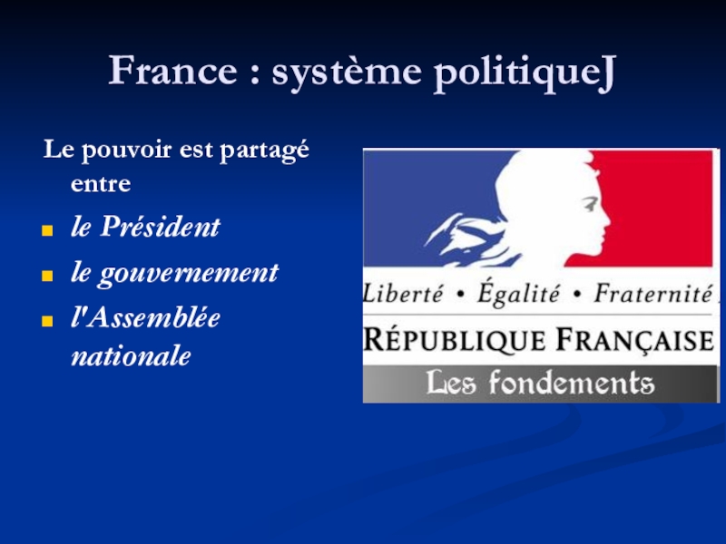 France : système politiqueJLe pouvoir est partagé entre le Présidentle gouvernement l'Assemblée nationale
