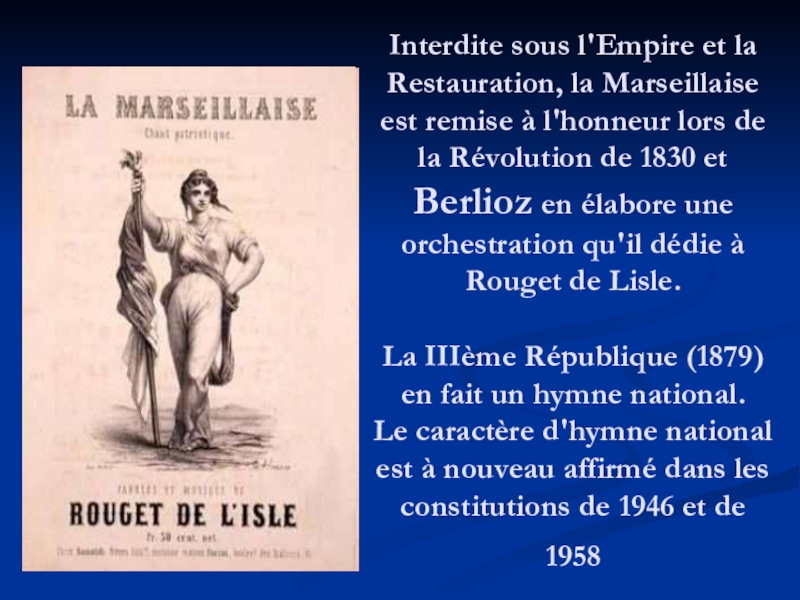 Слайд 4Interdite sous l'Empire et la Restauration, la Marseillaise est remise à