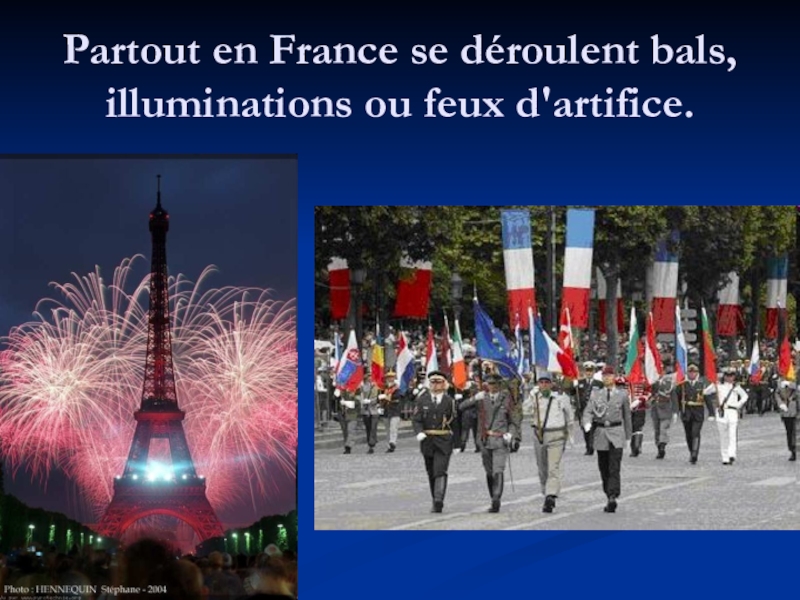 Слайд 12Partout en France se déroulent bals, illuminations ou feux d'artifice.