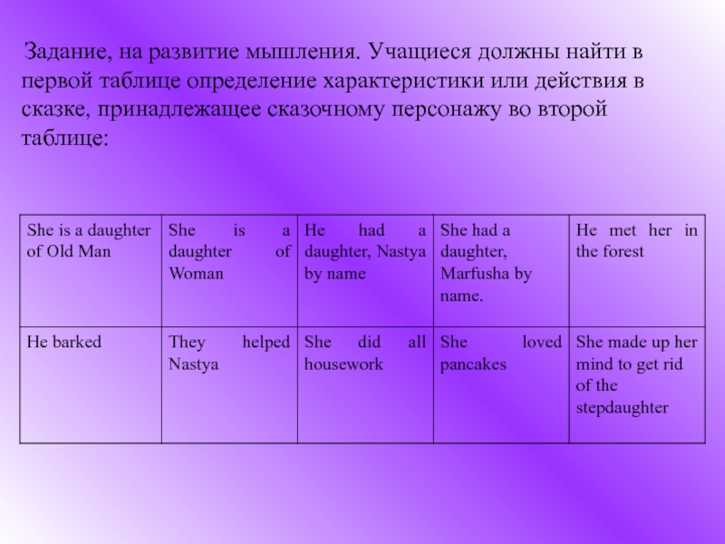 определение характеристики или действия в сказке, принадлежащее сказочному персонажу во второй таблице:
