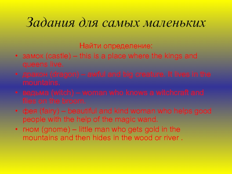 гном (gnome) – little man who gets gold in the mountains and then hides in the wood or river .