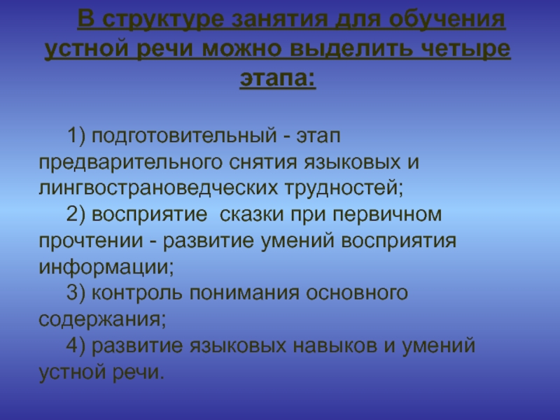 В структуре занятия для обучения устной речи можно выделить четыре этапа:
