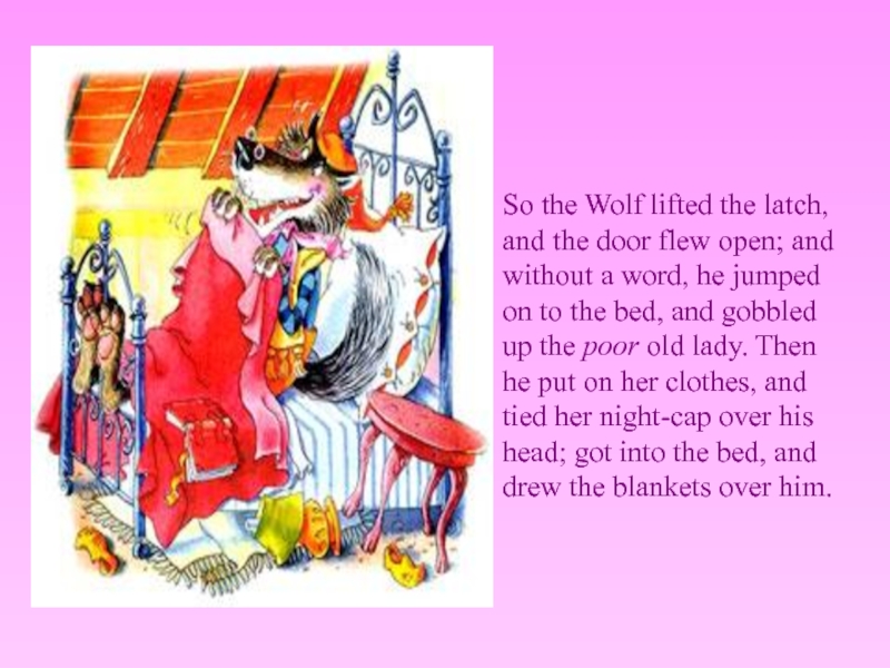 Слайд 27So the Wolf lifted the latch, and the door flew open;