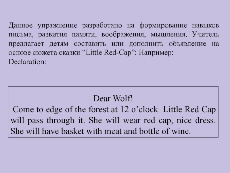 Учитель предлагает детям составить или дополнить объявление на основе сюжета сказки “Little Red-Cap”: Например: