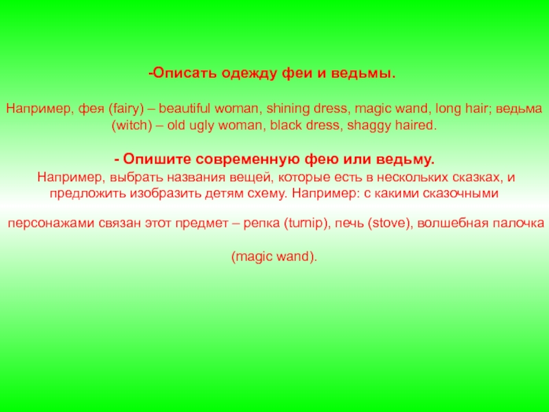 shining dress, magic wand, long hair; ведьма (witch) – old ugly woman, black dress, shaggy haired.