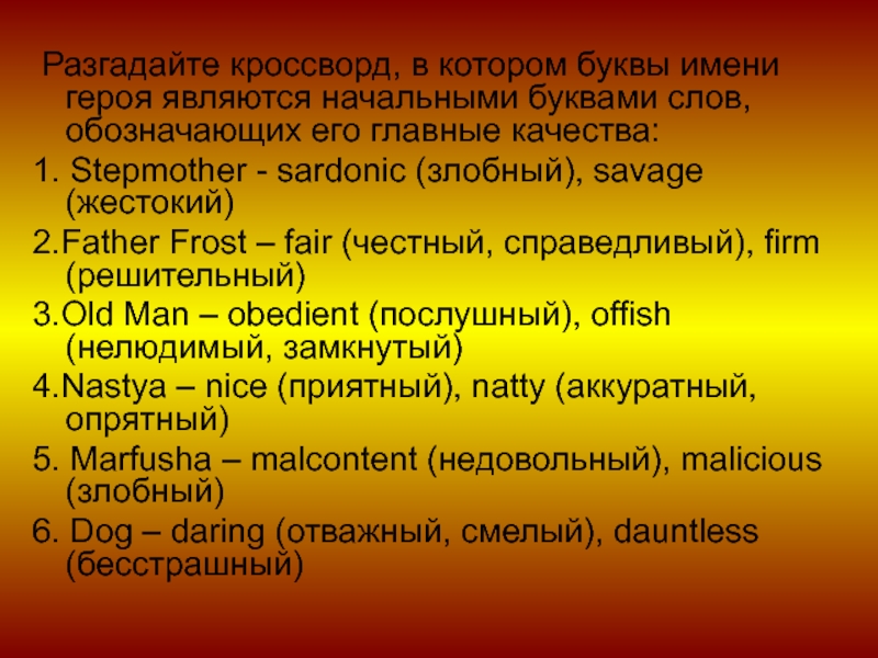 1. Stepmother - sardonic (злобный), savage (жестокий)