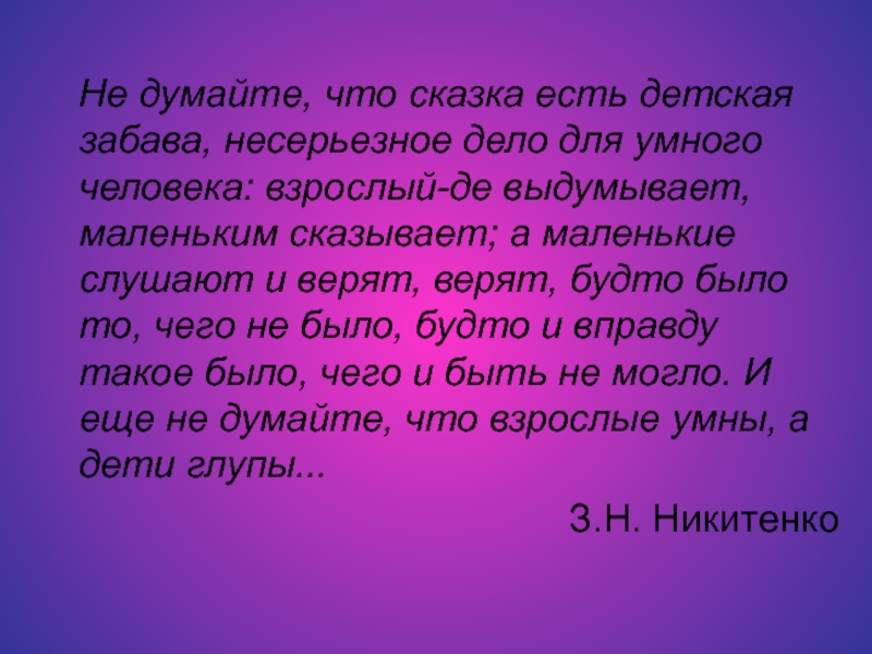 Слайд 2 Не думайте, что сказка есть детская забава, несерьезное дело