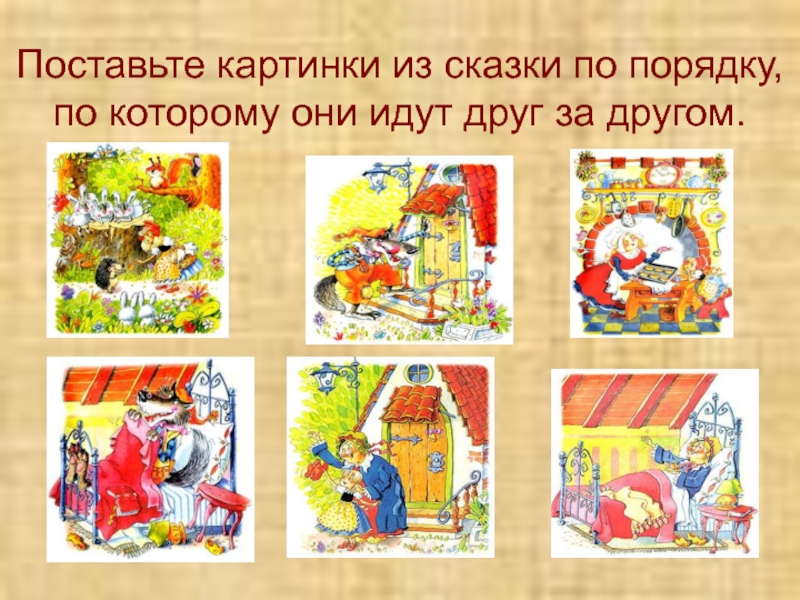 Слайд 34Поставьте картинки из сказки по порядку, по которому они идут друг