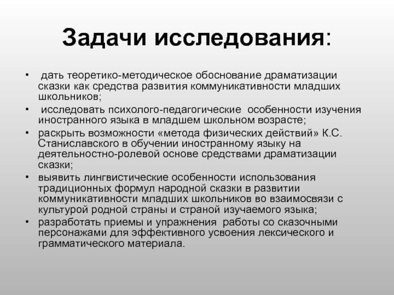 раскрыть возможности «метода физических действий» К.С. Станиславского в обучении иностранному языку на деятельностно-ролевой основе средствами драматизации сказки;