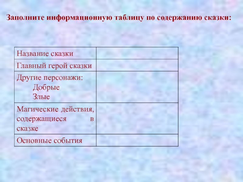 Слайд 31 Заполните информационную таблицу по содержанию сказки: