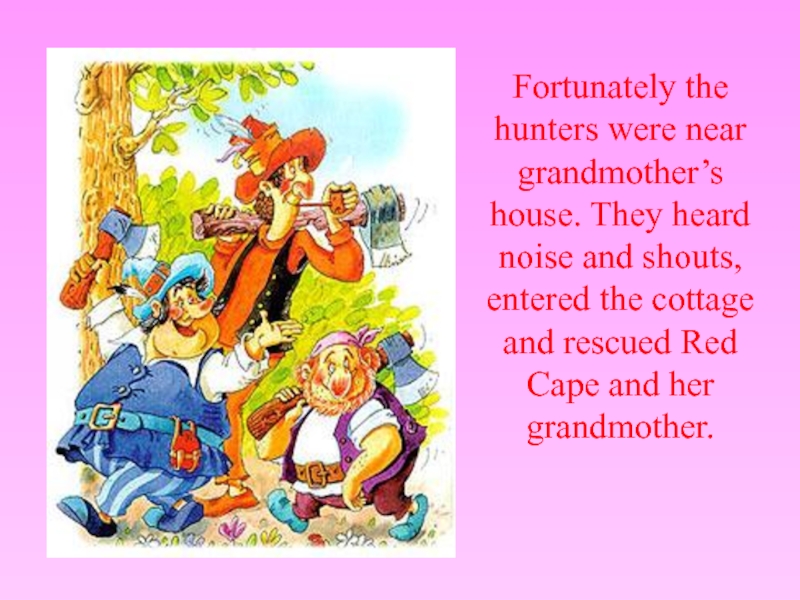 Слайд 28Fortunately the hunters were near grandmother’s house. They heard noise and